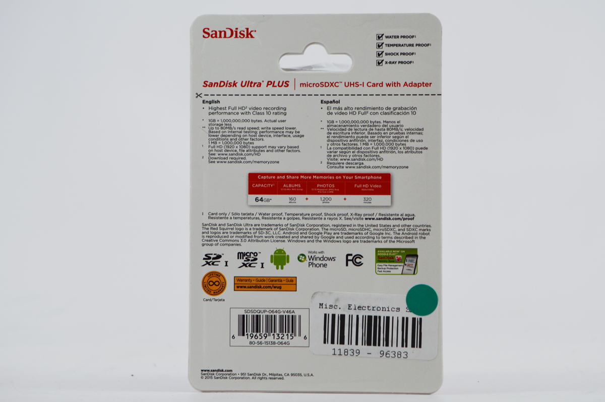 Sandisk Ultra Plus 64 GB memory card with adapter.